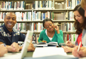 Group of college students studying in library